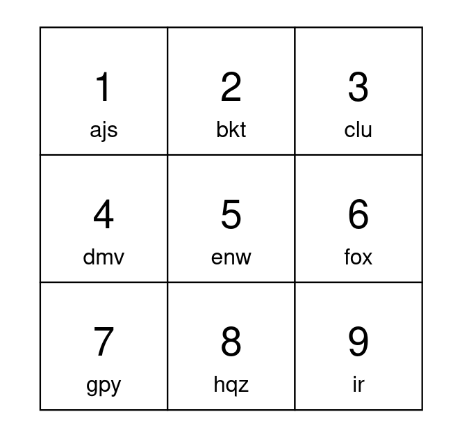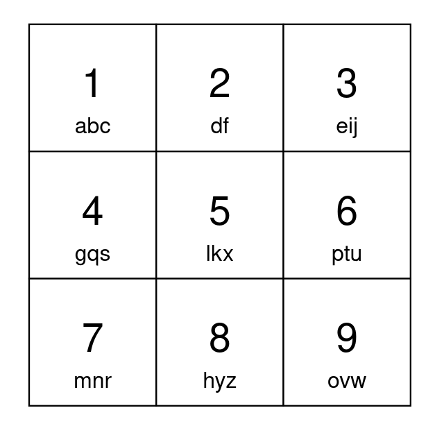 You have a keypad with 9 buttons, numbered from 1 to 9, each mapped to lowercase English letters. You can choose which characters each button is matched to as long as: